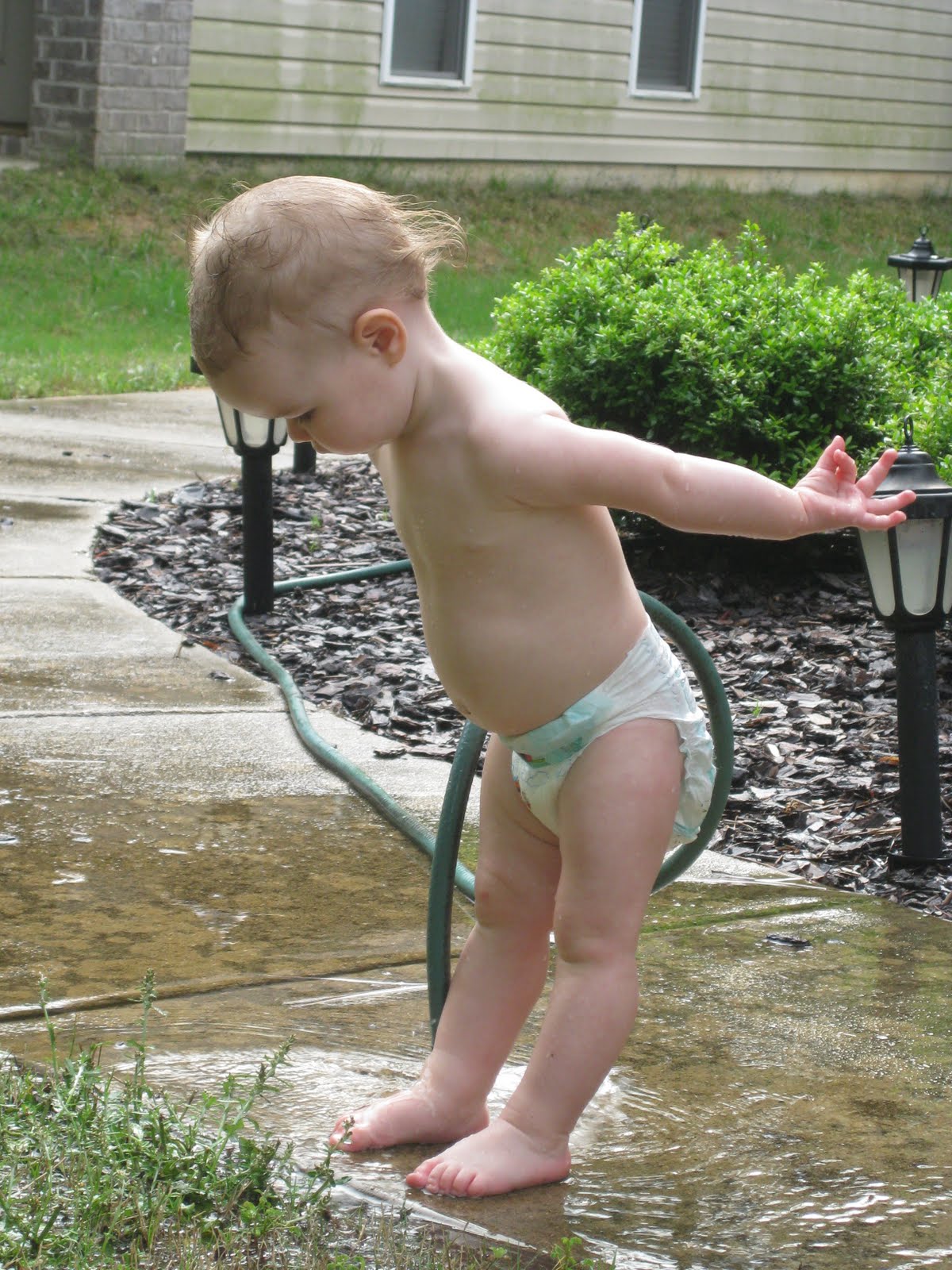 So the other day we let Delaney try out the hose pipe and she loved it. After she showed so much love for the hose pipe I thought she might like to try out the sprinkler. Not so much! It was the day it rained so it was kind of cold outside and the water was freezing and she didn't want anything to do with it. David even got in with her and was running around like a crazy man and she was dying laughing at him. She thought it was really funny but not funny enough to join in!